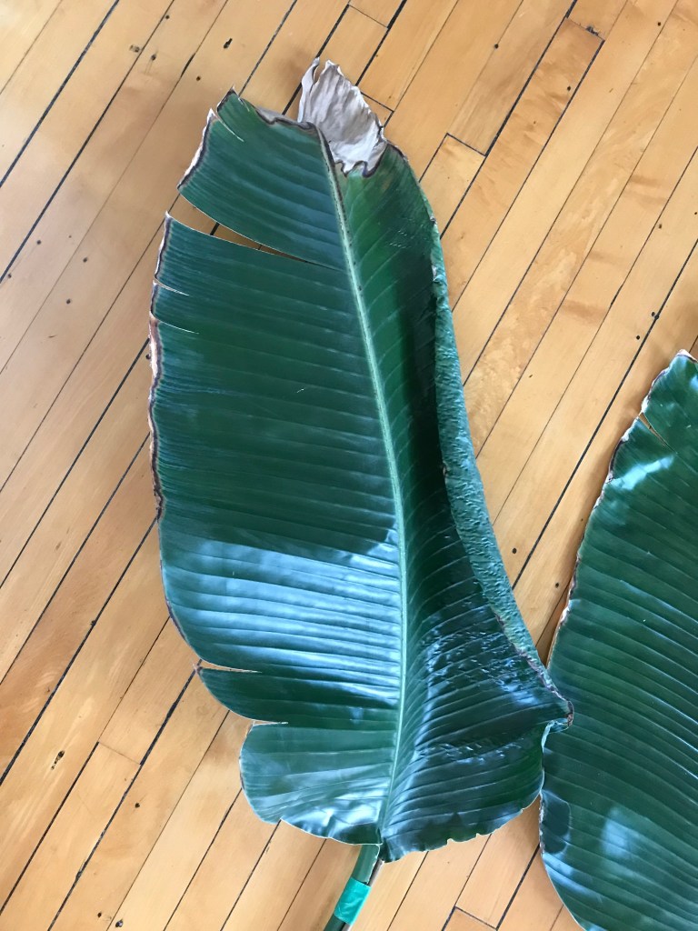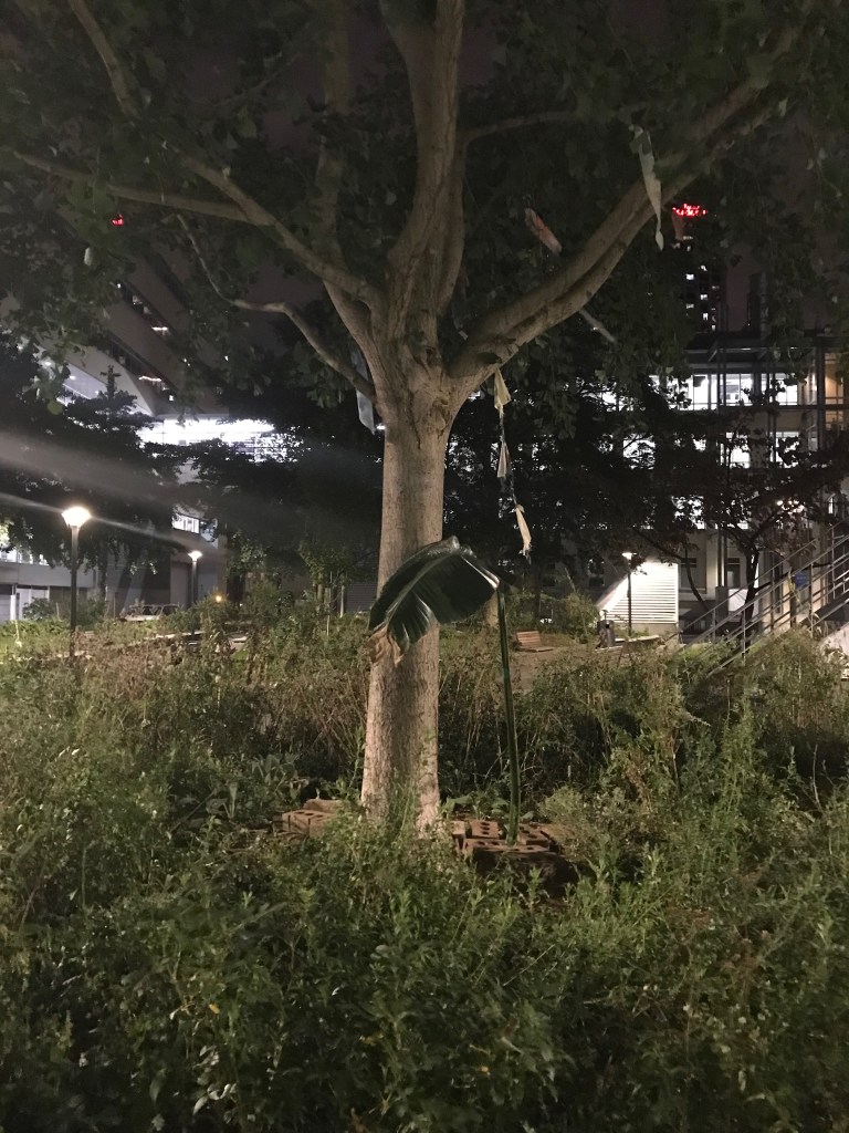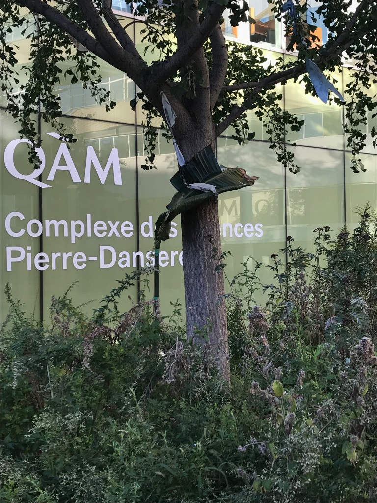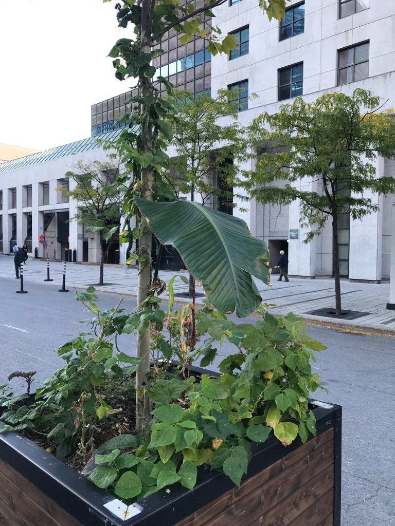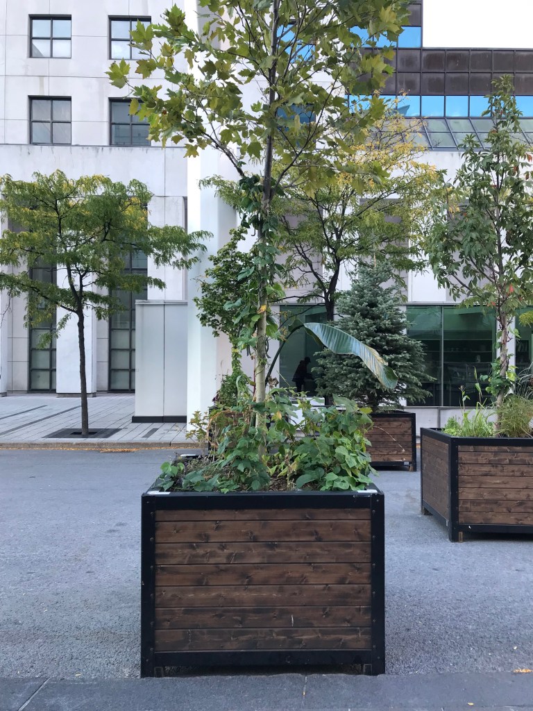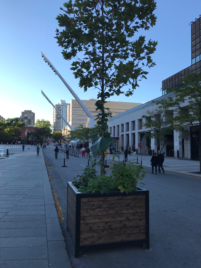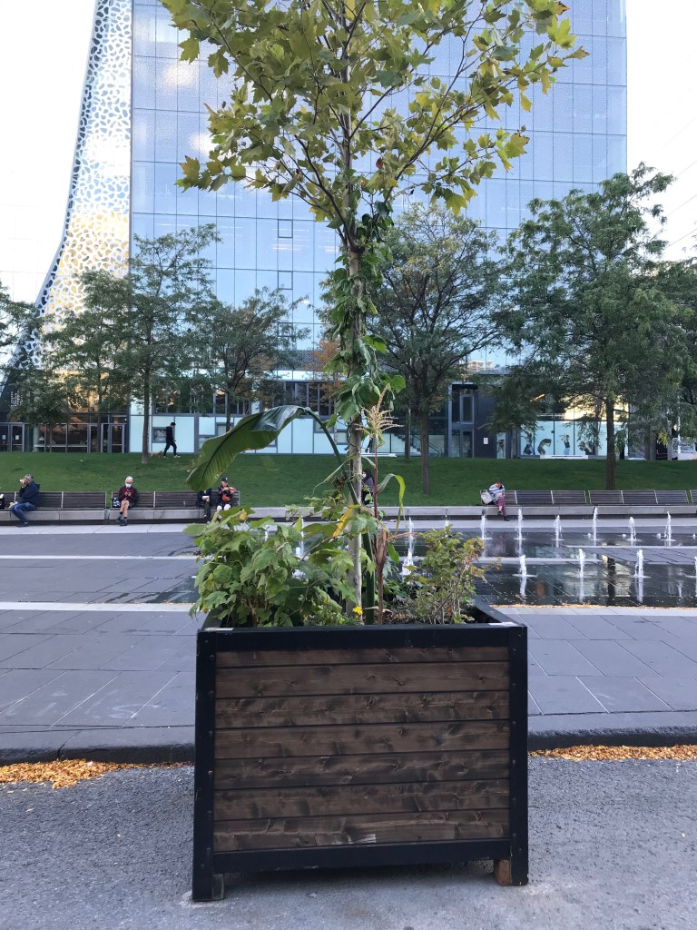 Le 29 septembre 2021, deux feuilles ont été coupées et transportées vers le quartier des spectacles. La promenade nous a menées d’abord vers le Cœur des Sciences de l’UQAM, où je me rendais régulièrement pendant cette période d’élaboration intense de mon projet de maîtrise. Au cœur du quadrilatère formé par l’Avenue du Président-Kennedy, les rues Sherbrooke, Saint-Urbain et Sainte-Famille, un petit village de pavillons universitaires entourent un espace verdoyant l’été. J’ai déposé une première feuille à cet endroit où des compagnes verdoyantes ont accueilli la nouvelles venue. Je me suis ensuite dirigée à deux pas de là, vers un deuxième cœur, celui-là du quartier des spectacles. J’y ai déposée la deuxième feuille qui a pris place avec d’autres verdures dans un bac posé sur la place. Peu de gens ont été témoins, ou n’ont pas accordé d’attention à ce qui se marchait là.