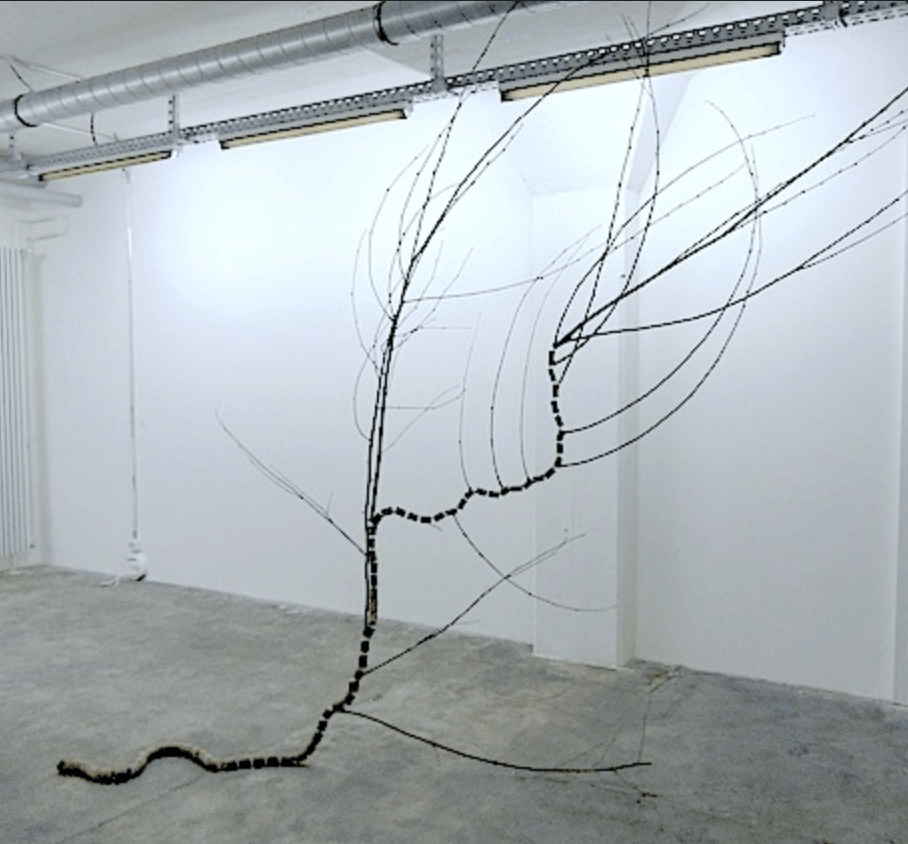 Chaque protocole choisi a déterminé des actions et des rencontres, ce qui a influencé l’attention et transformé l’expérience du trajet. Cela a suscité des questionnements : à chaque nouvelle itération de trajectoire, j’ai cherché comment le lieu et le moment du trajet pouvait générer une reconduction ou une continuité de trajet. S’est alors imposée une recherche de possibilités de création en simultanéité à la trajectoire, in situ. Au centre de l’étoile que dessinaient ces trajets étendus sur trois pays, mon atelier à Bâle était le point de convergence, d’amoncellement et de réagencement des matérialités et des données collectées pendant ces six mois en résidence d’artiste. En a résulté une installation multiforme dont chaque direction possède sa propre couleur. La dernière trajectoire fut parcourue à pied entre Thoune et Bâle en février 2014 (trajectoire sud, ligne jaune sur la carte) avec une profusion de 5500 images et séquences filmées sur le trajet, qui furent assemblées en une vidéo de 42 minutes en 2018.