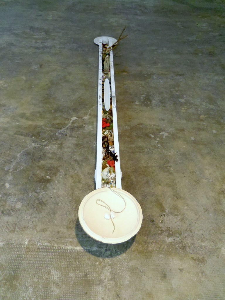 Sculpture en forme d’écrin où sont alignés des éléments disparates trouvés dans un trajet à vélo et à pied. L’œuvre réagence ces objets et propose d’en imaginer de nouveaux récits par associations d’idées.