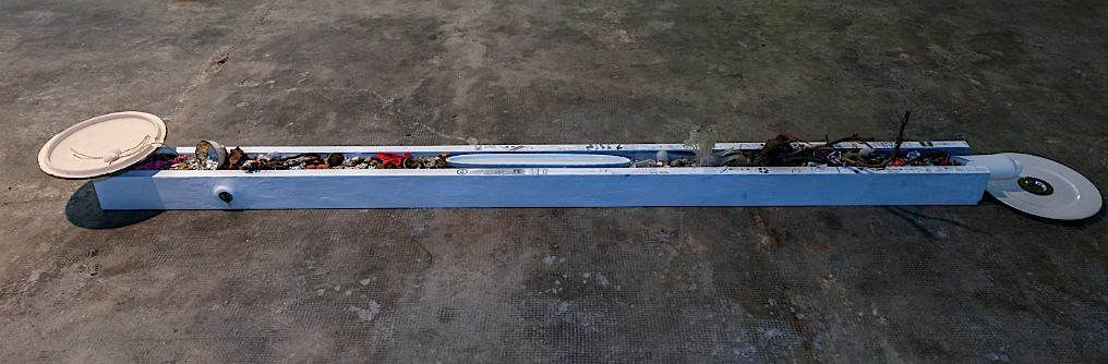 A sculpture in the form of a water channel containing a collection of disparate objects found during a journey by bike and on foot. The work rearranges these objects and invites viewers to imagine new narratives through associations of ideas.