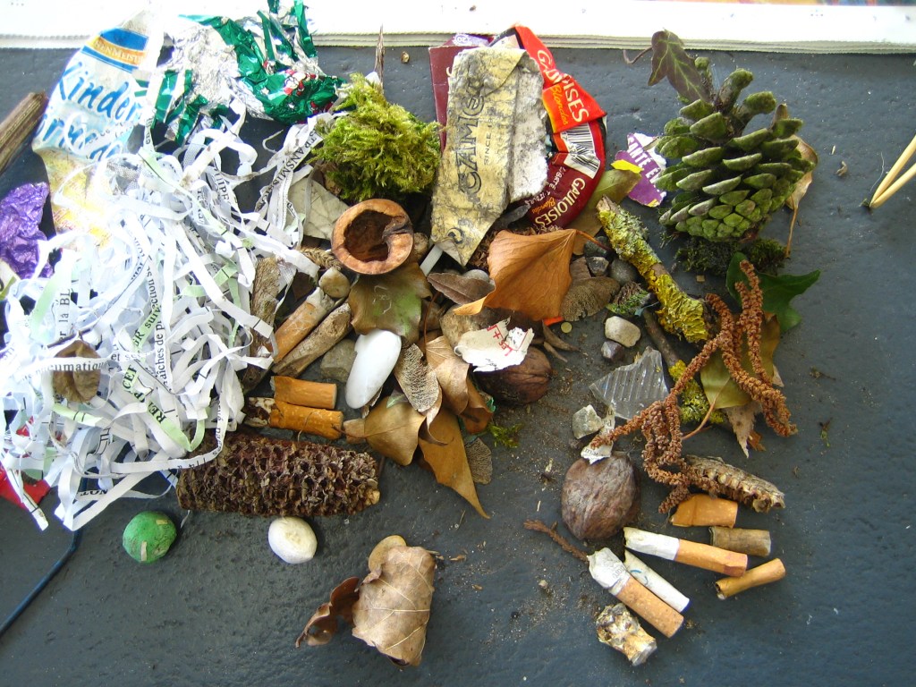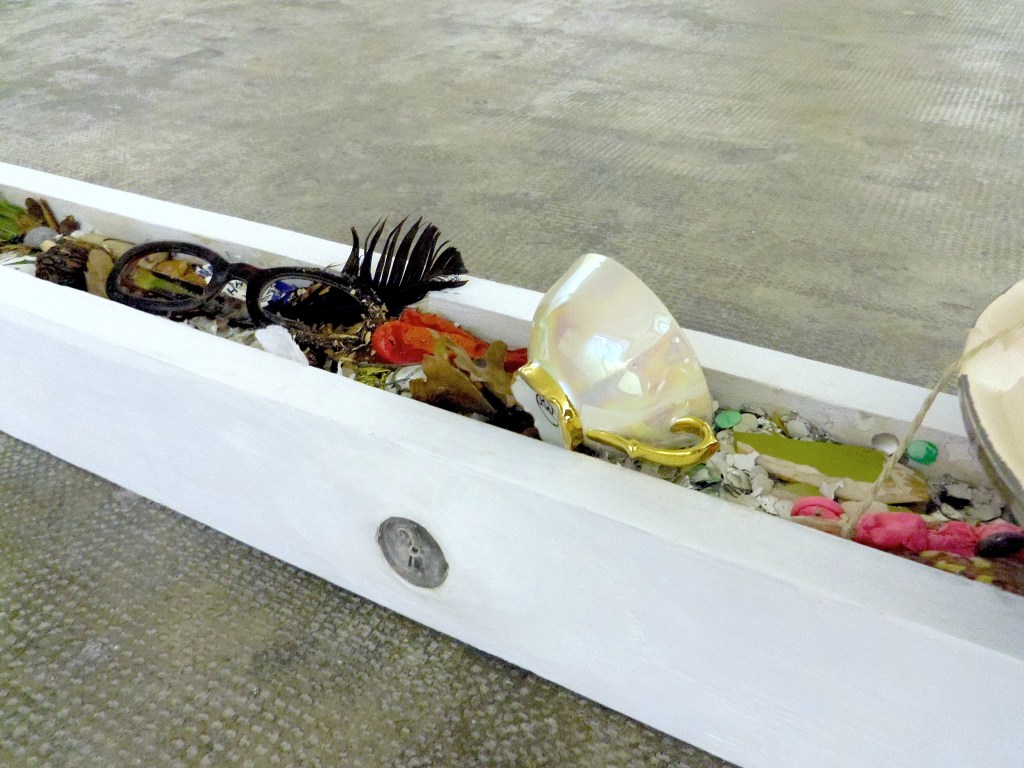 coffrage en bois, plâtre, colle époxy, céramique et divers matériaux et objets.