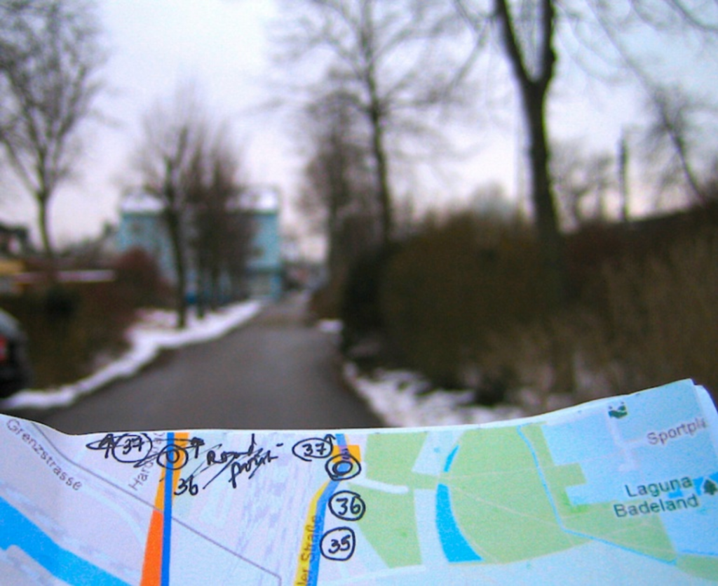 Je dispose d’une carte routière sur laquelle un trait bleu marque le chemin que j’ai choisi, le plus près possible d’un axe nord, orienté de mon studio de résidence. Mais ici sur les lieux qui me sont anonymes, le dessin de ma carte ne correspond pas bien aux allées, rues, sentiers ou routes; et pas du tout au champs, maisons, arbres, roches, pancartes et enseignes. Je compte, je cherche des correspondances, je déduis. Il n’y a pas d’erreurs d’indications puisqu’il n’y a pas de dimension vérifiable. Cette carte s’applique à n’importe quel lieu puisqu’elle n’est qu’une partition sélective subjective. Si je changeais d’instrument, c’est à dire de système de lecture et d’emplacement, cela pourrait encore fonctionner. La convention de cette carte m’a toutefois permis de trouver cet endroit. Je dois absolument – aveuglément, avoir la foi de – croire qu’elle m’a mené à exactement huit km en direction nord, en latitude et longitude, de mon point de départ qui est mon studio de travail à Bâle. C’est avec cette convention choisie que je pourrai réaliser mon projet.