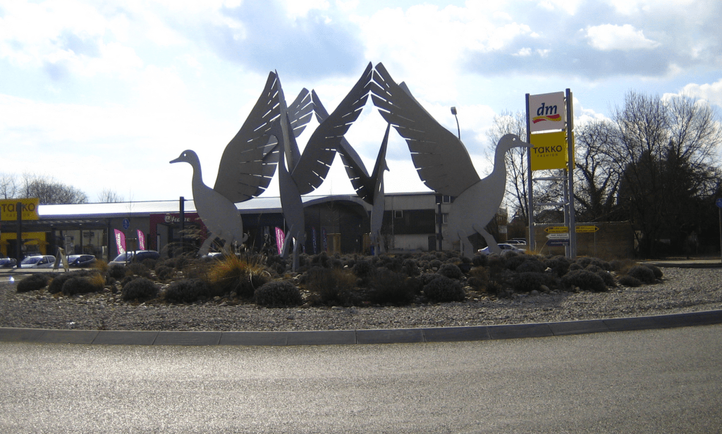Je contourne le centre d’achat et prends la Basler Strasse, la route qui m’a emmenée en autobus près de mon point de départ. Le jour est plus sombre. J’installe 7 rubans avant de passer en Suisse. Je suis encore pour quelques pas en Allemagne, à Weil am Rhein qui est le point de rencontre avec la Suisse et la France: Dreiländereck. En voici le symbole. Ici se trouve le musée de design Vitra. Sur les parterres on voit de grandes et petites sculptures..