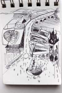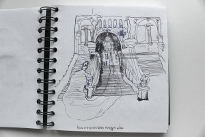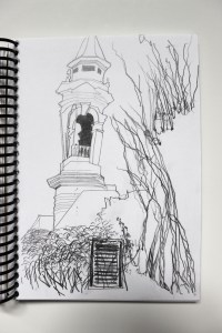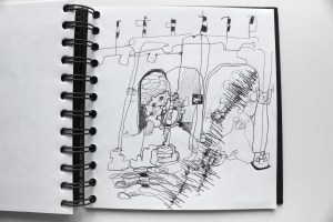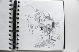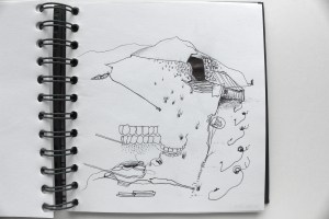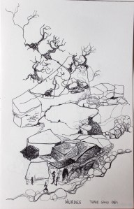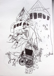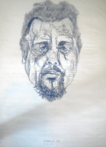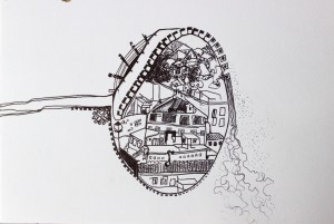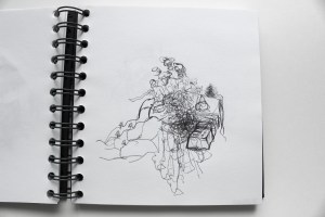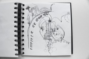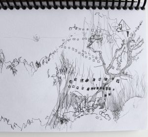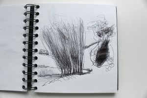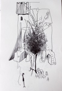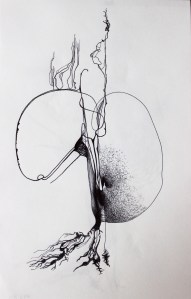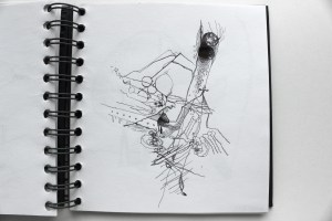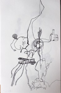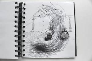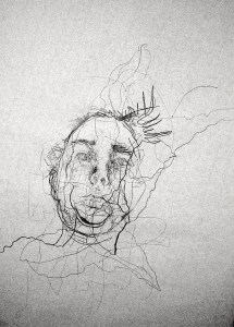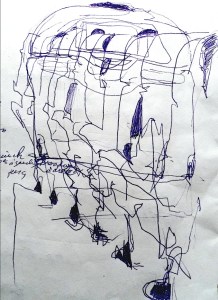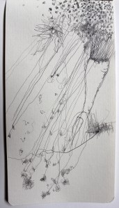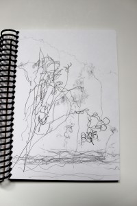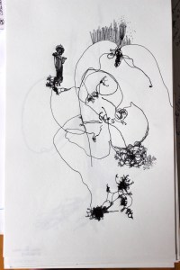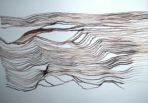 Michel Serres parle de métissage et de contrariété; s’introduire dans un environnement qui nous est étranger et apprendre à y nager, hors repères, dès lors on ne devient pas autre mais l’on devient double. On apprend en se déformant, en se contrariant. Dessiner dans la contrariété, c’est un paradoxe très personnel. Une image initiale intérieure floue pré-existe. Pour déstabiliser le contrôle et l’attendu, je dessine en marchant, dans le noir, en utilisant des fluides difficiles, ou avec des taches du quotidien. Je cherche des moyens d’accès vers des lieux inconnus et des formes imprévisibles pour créer des conditions de perdition.