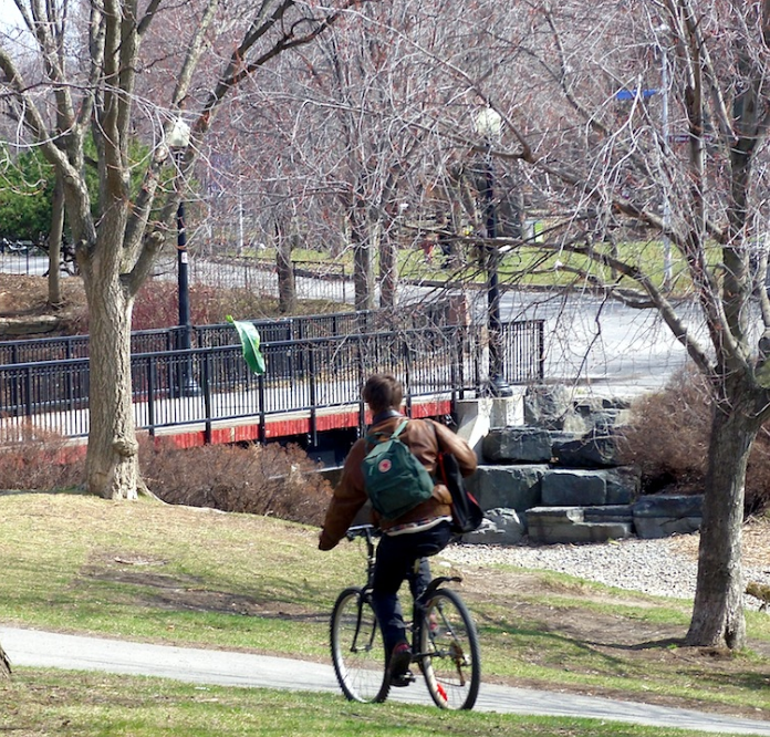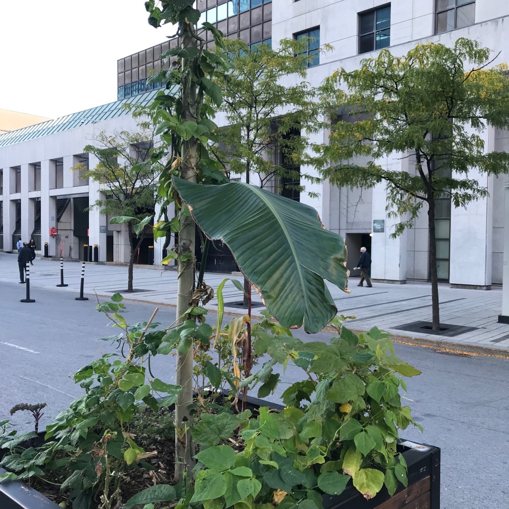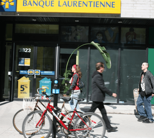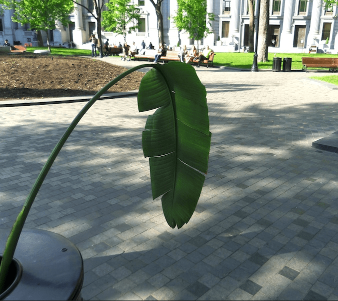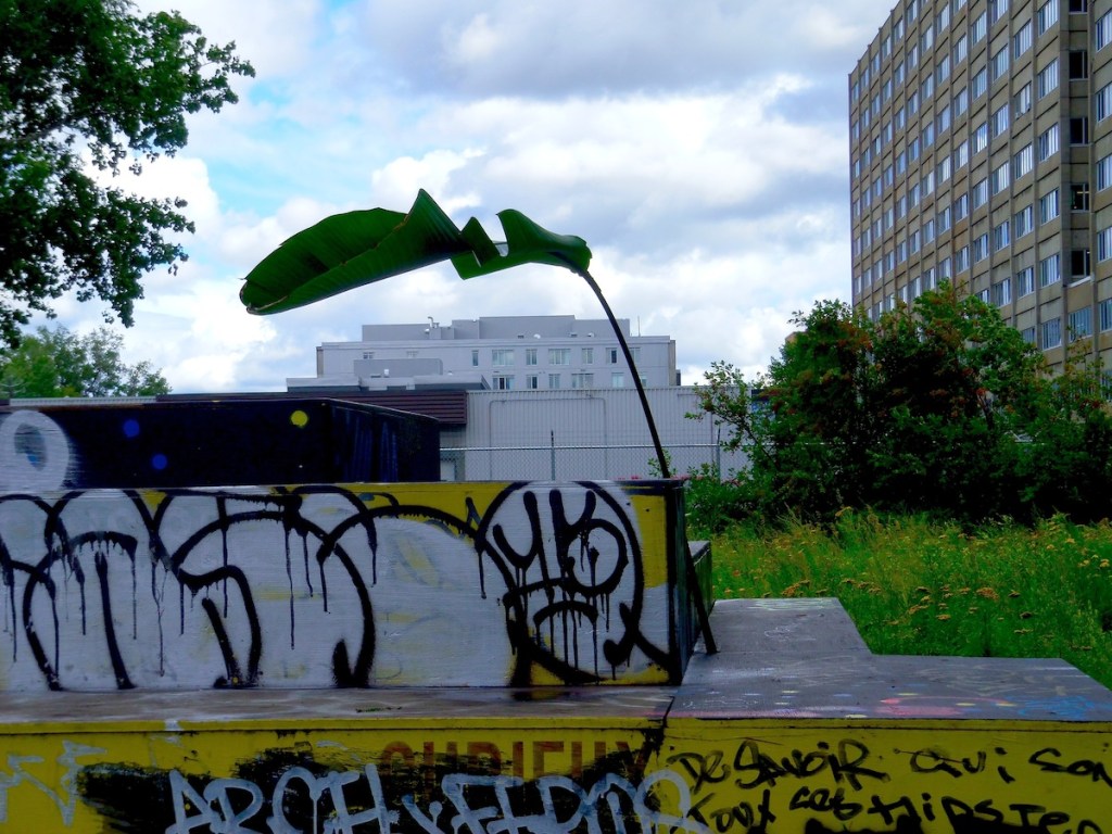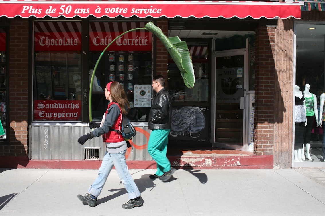 La plante en ville – the plant-in-town – are urban walks that first started in April 2009. To date, they’ve consisted in 15 walks towards various districts of Montreal, with a giant leaf cut out of a Traveller’s Tree, an interior tropical plant. Each promenade leaves from where the plant grows. The cut out leaf is then transported to the outside, to be disseminated in different directions in the city. Each leaf is left in place at the end of the route. The isolated enclosed and exclusive plant accesses to the external environment and becomes public. On the plant, the stems and leaves are connected in a fan form shape; the walks are extensions of these axes.
