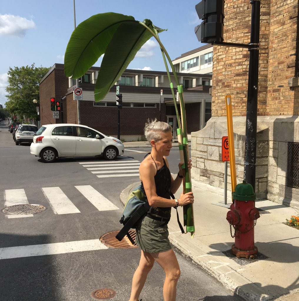 la plante en ville sont des promenades urbaines qui ont lieu depuis avril 2009. Elles ont consisté jusqu’à maintenant en 15 promenades vers différents quartiers de Montréal, avec une feuille géante coupée de l’Arbre du Voyageur, une plante tropicale. Chaque promenade part du logis où la plante pousse. Une des feuilles est coupée, puis transportée à l’extérieur, pour être disséminée vers différentes directions dans la ville. Chaque feuille est laissée sur place au bout du trajet choisi. La plante isolée et exclusive accède à l’environnement extérieur accessible et devient publique. Sur la plante, les tiges et feuilles sont reliées en éventail; les promenades sont des prolongations de ces axes.