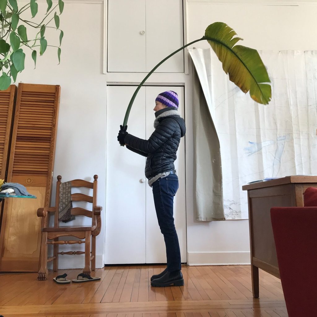 Lorsque les plus vieilles feuilles s’affaissent, elles sont coupées pour permettre à la plante de se régénérer. Ces amputations correspondent à l’apparition d’une nouvelle feuille qui sort du cœur de la plante. Auparavant, je découpais en morceau la vieille feuille encore verte et vivante, coupée au bas de sa tige, et je la mettais dans un sac plastique que je jetais aux poubelles. Mais j’ai voulu qu’elle ait accès à l’existence hors mes murs, même pour un court moment. C’est comme ça que sont nés ces voyages. Les amputations de l’Arbre du voyageur voyagent.